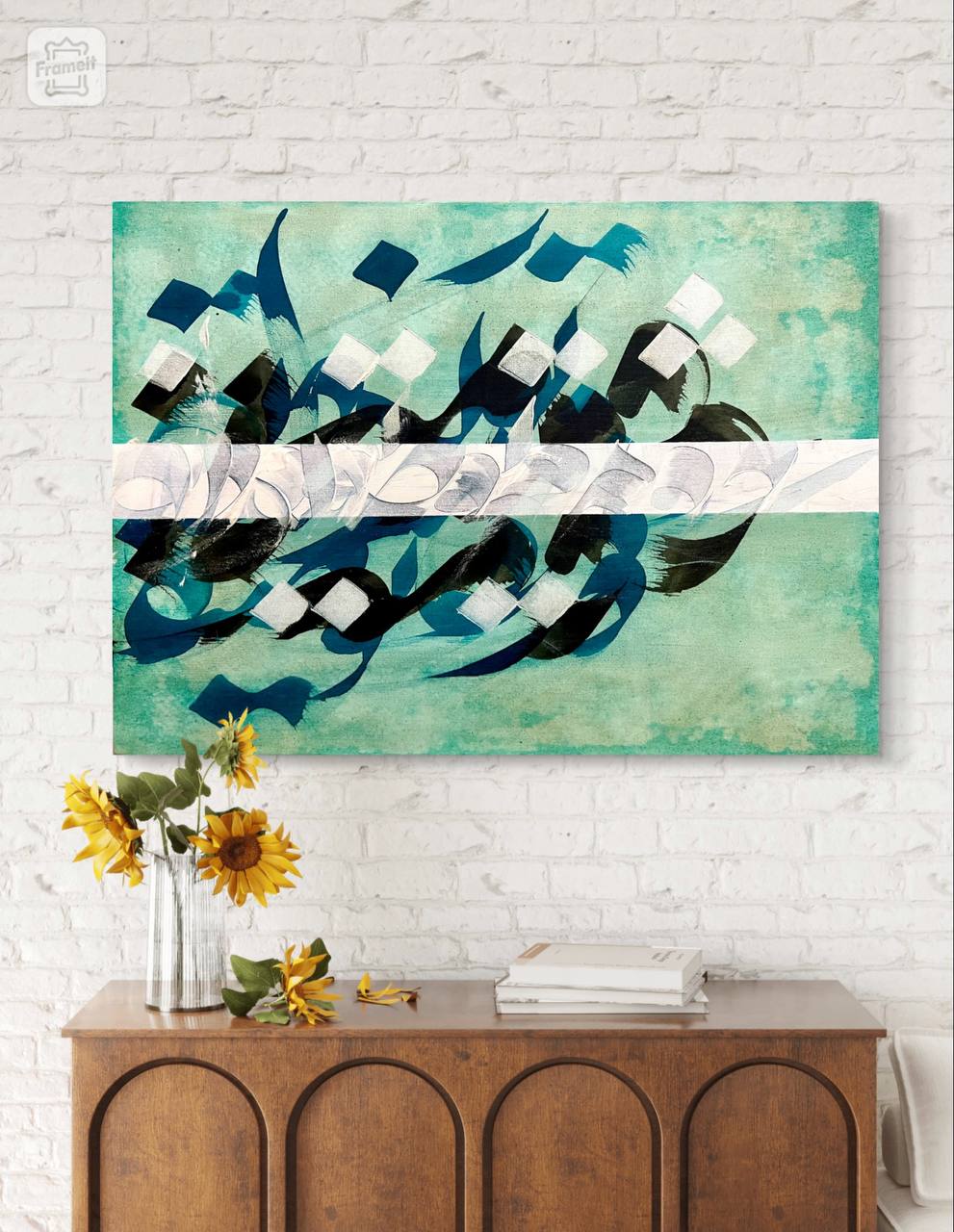 تابلو نقاشیخط مدرن سفید، فیروزه ای